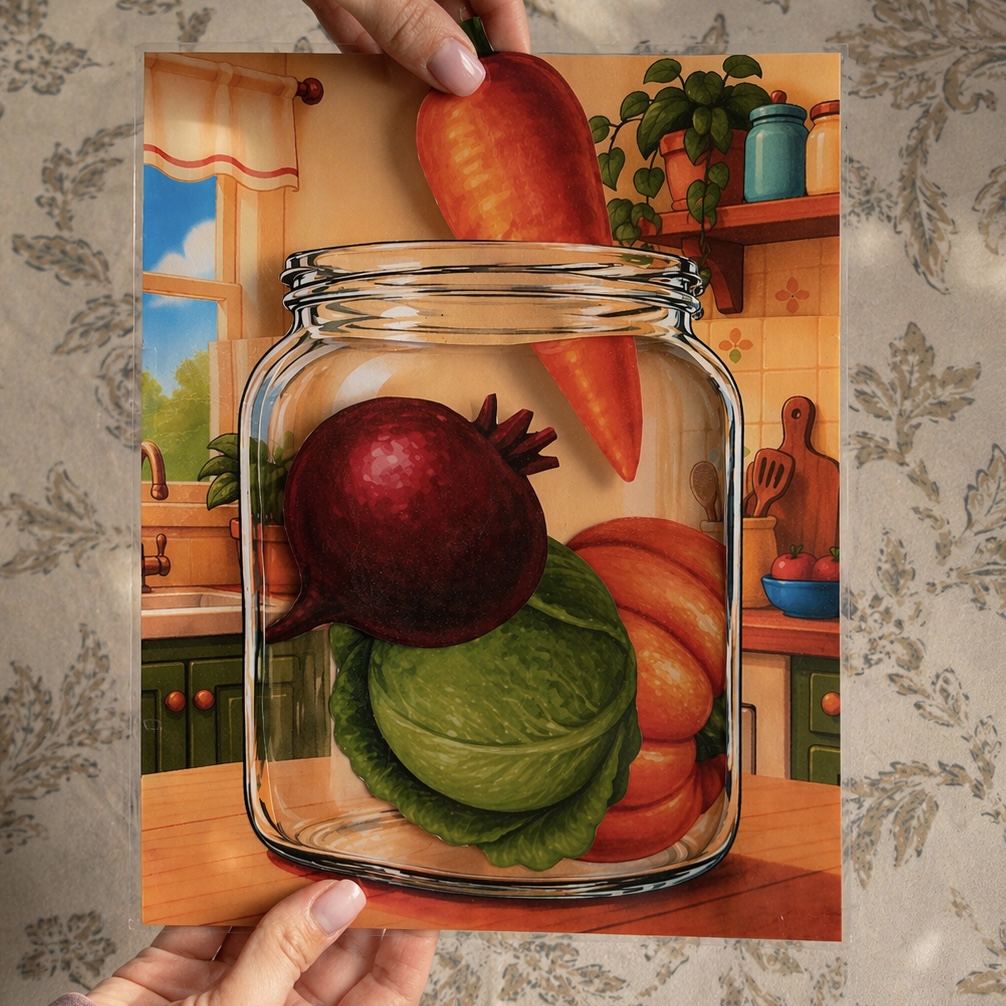 В комплект входят два листа формата А4 с изображением банки. Один из листов содержит целое изображение, второй — шаблон с выделенной центральной частью. В центральной части необходимо аккуратно вырезать белое окошко, после чего рекомендуется заламинировать лист для создания прочного прозрачного слоя. Далее оба листа совмещаются и соединяются по краям (например, с помощью скотча), в результате чего получается «банка» с прозрачным окошком.