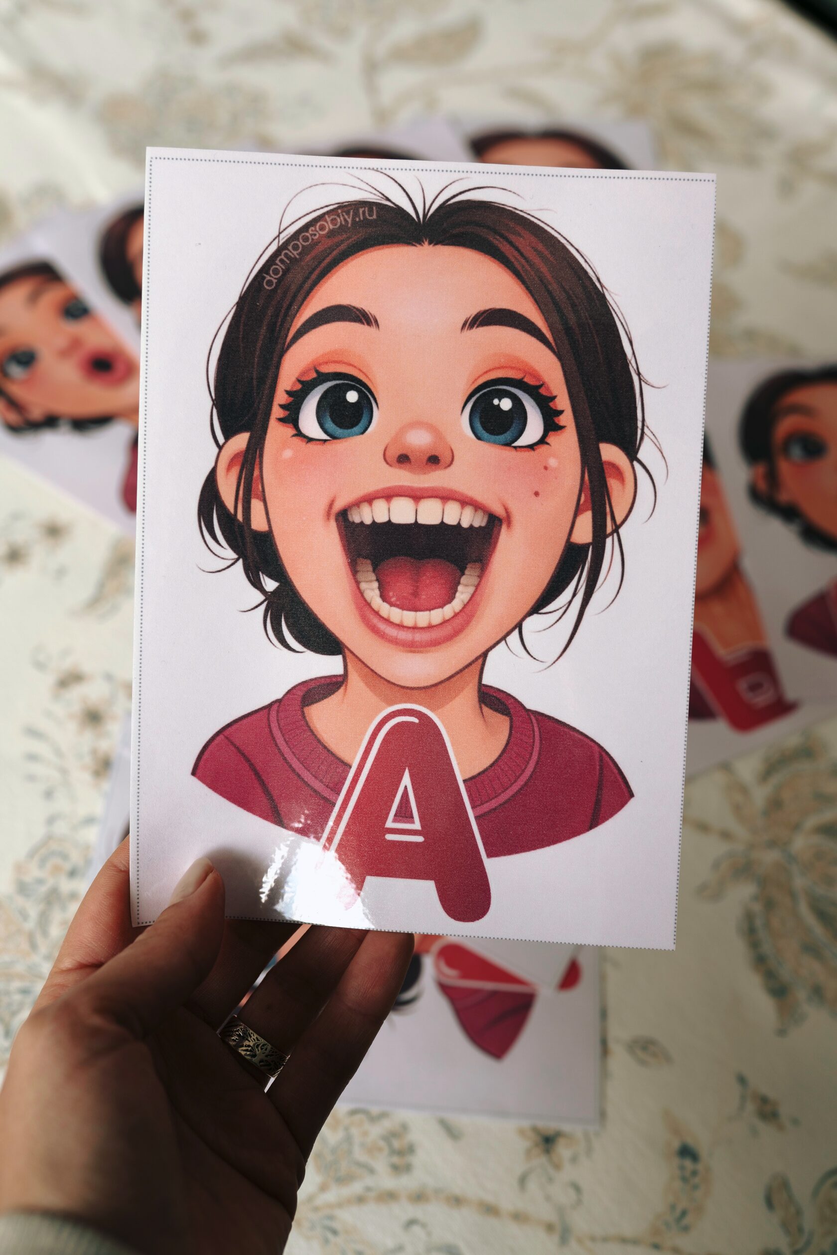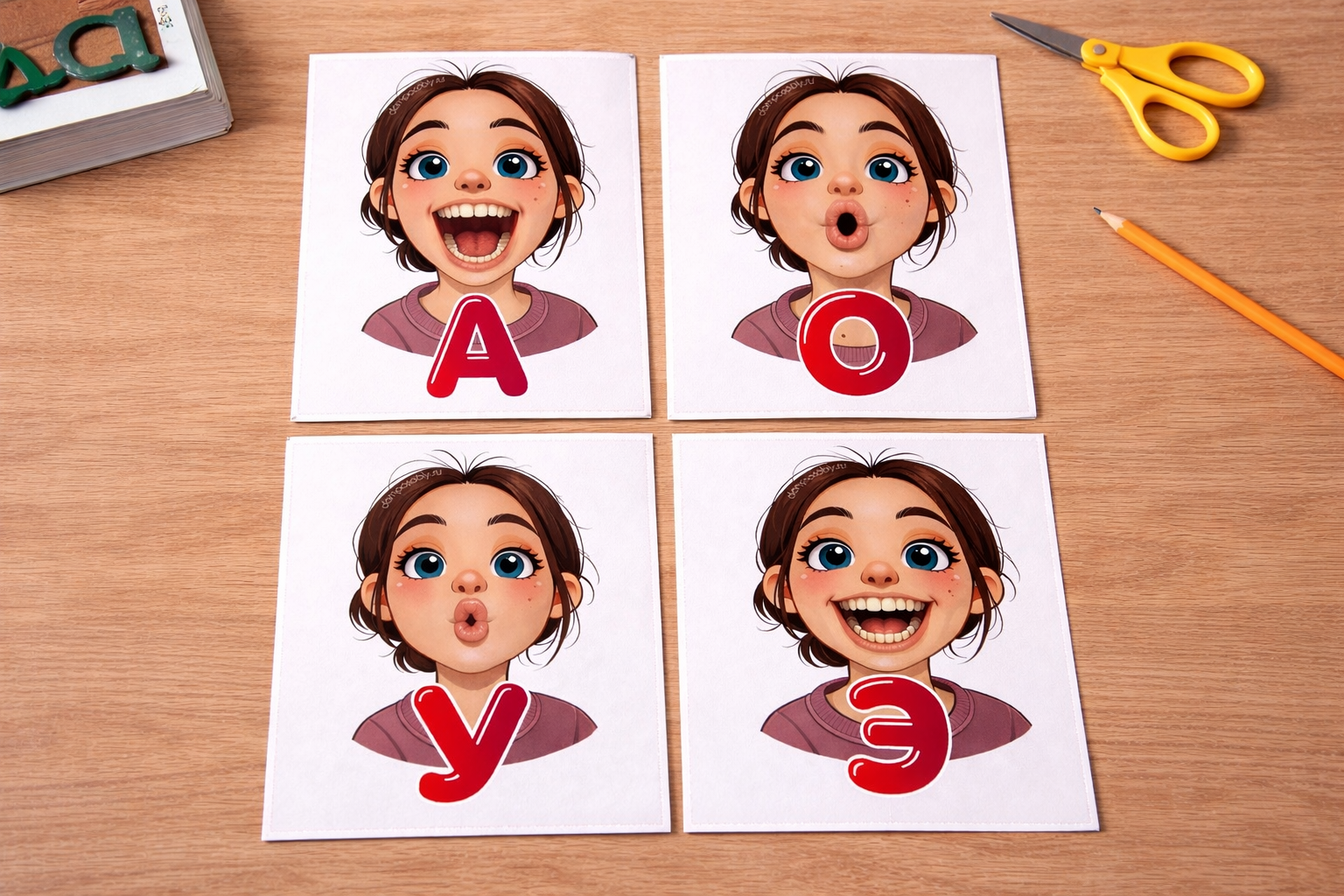 Наглядное пособие с карточками, на которых изображена девочка, демонстрирующая правильную артикуляцию всех гласных звуков русского языка. Материал помогает ребёнку понять положение губ и органов артикуляции, облегчает постановку и автоматизацию звуков.