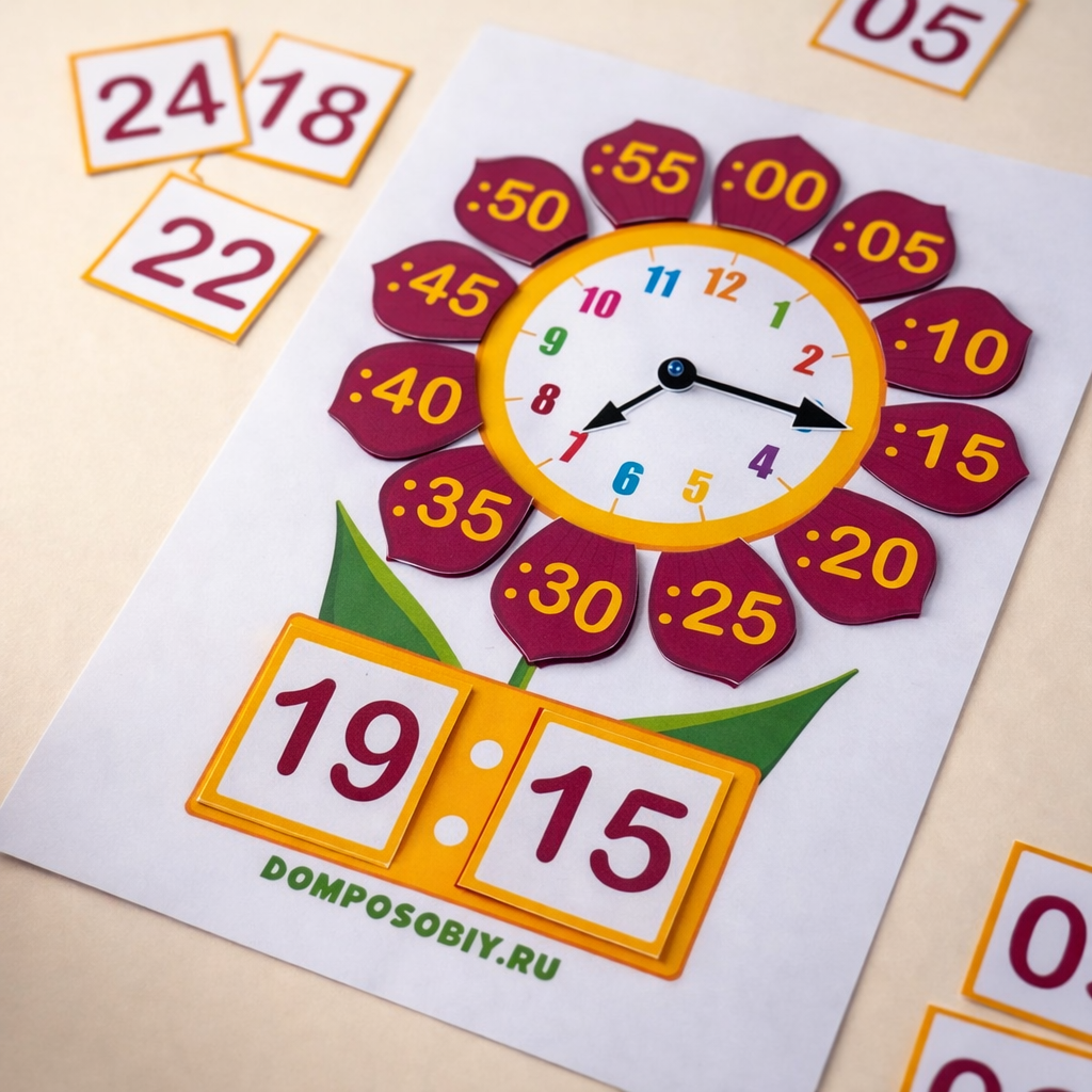 Наглядное и интерактивное пособие помогает детям легко разобраться с часами и минутами. Благодаря подвижным стрелкам и съёмным лепесткам с минутами (05, 10, 15, 20, 25… 55), ребёнок может самостоятельно составлять разные варианты времени и тренироваться в игровой форме.