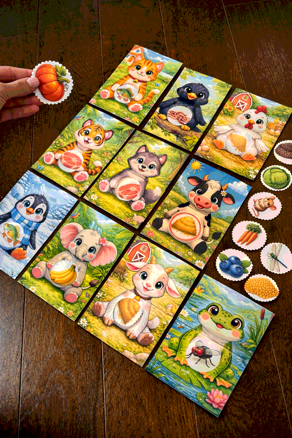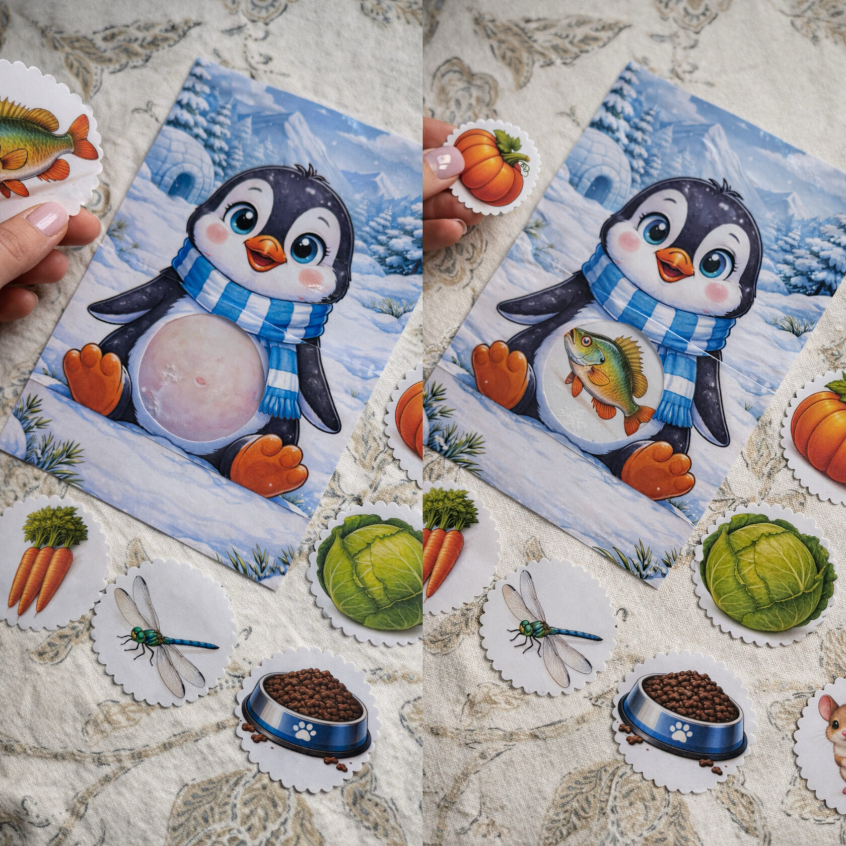 Карточки с животными, которых нужно «накормить», помогают ребёнку в игровой форме научиться различать, кто что ест, развивают мышление, внимание и словарный запас. Ребёнок подбирает подходящую еду и помещает карточку-вкладыш в «животик» животного, устанавливая логические связи и расширяя представления об окружающем мире.